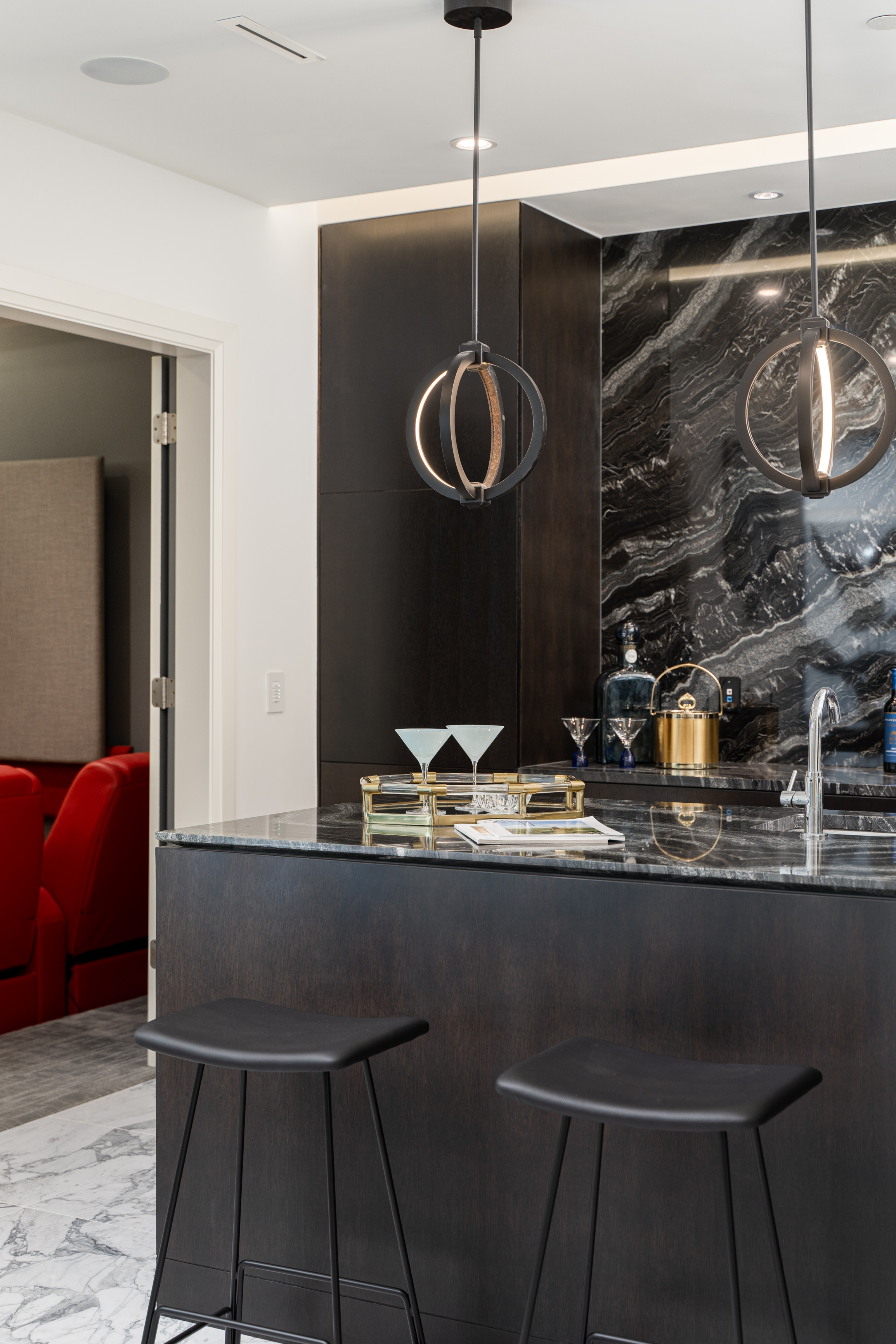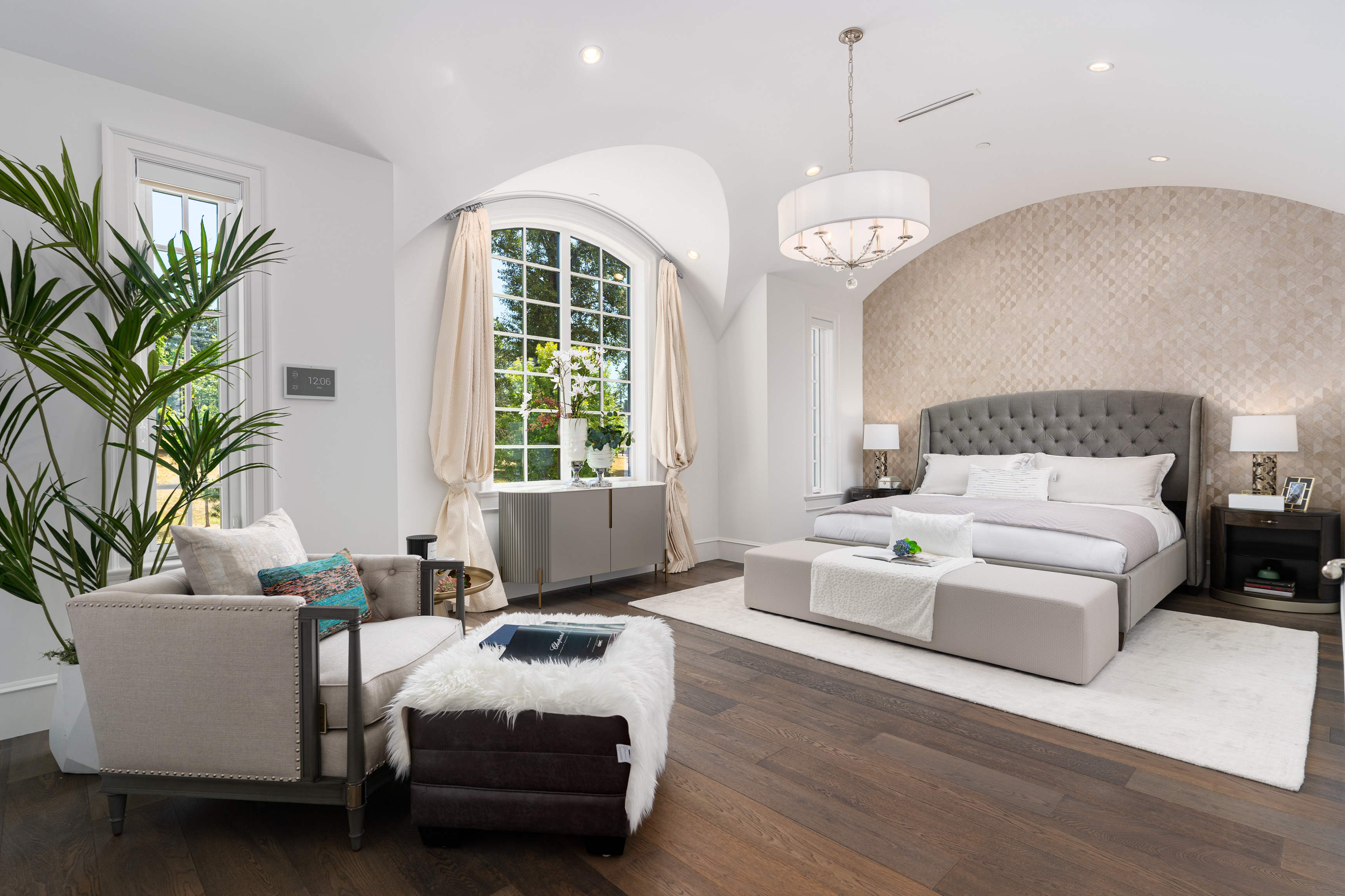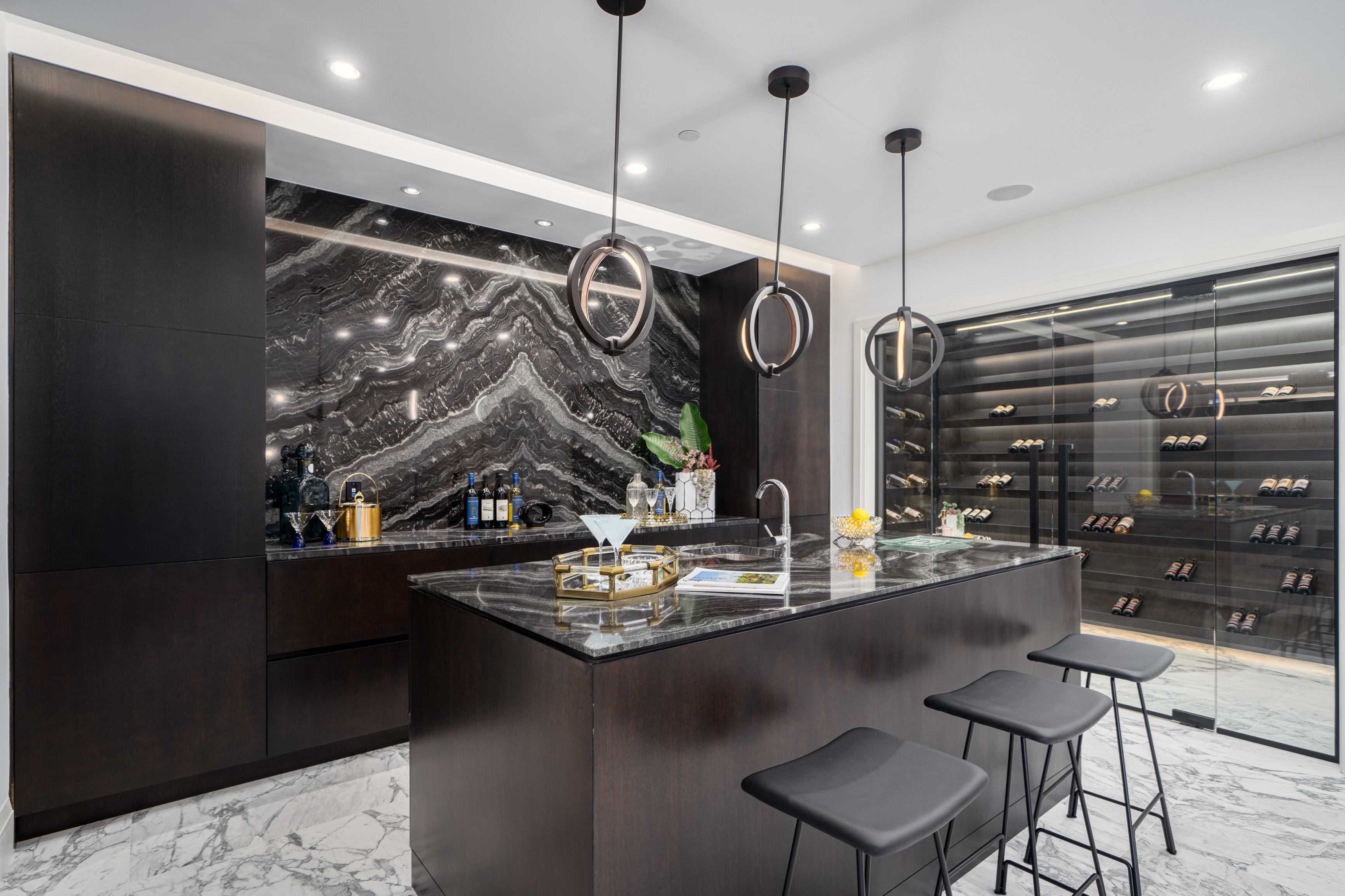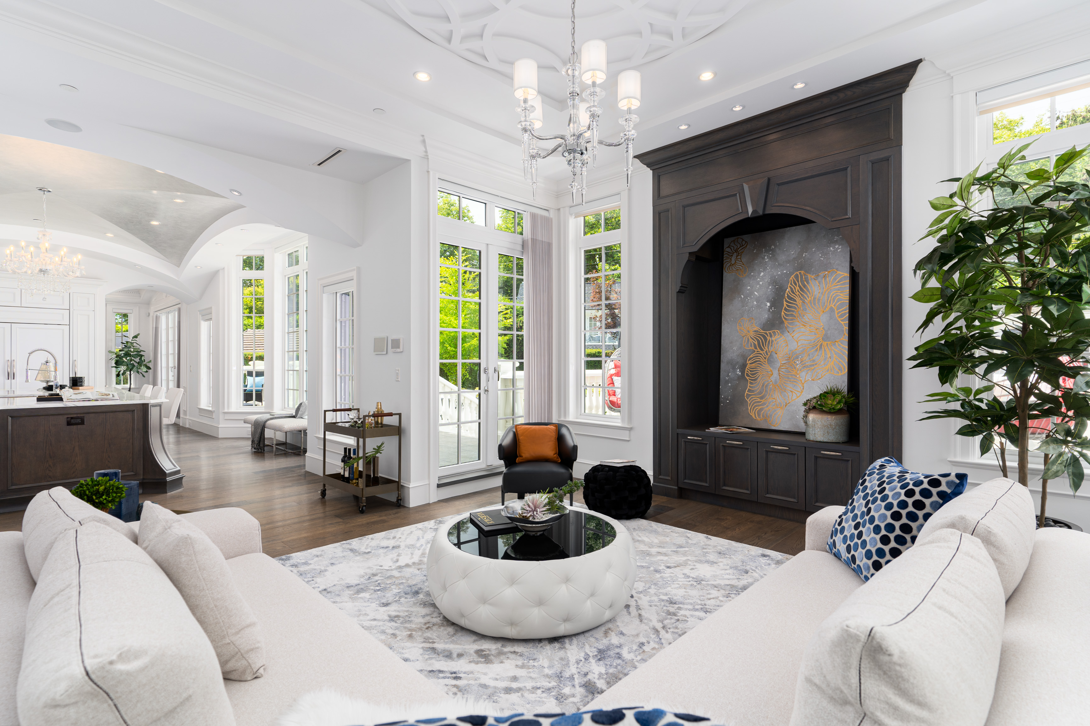 Custom-built 12-person theatre, chef's kitchen with WOLF Range & Sub-Zero appliances, wok kitchen with WOLF Range, custom curved stained white oak pedestal island, 500-bottle wine cellar, full bar, 4-car garage, Control 4 Home Smart System, and wrap-around auto-court.